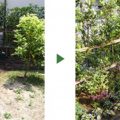 まずメインとなるモミジやサルスベリなどの高木を配置し、それぞれの木を囲むように低木を植え付け丸みのあるデザインに仕上げました。バラバラだった木が一体感のある植栽になりました。